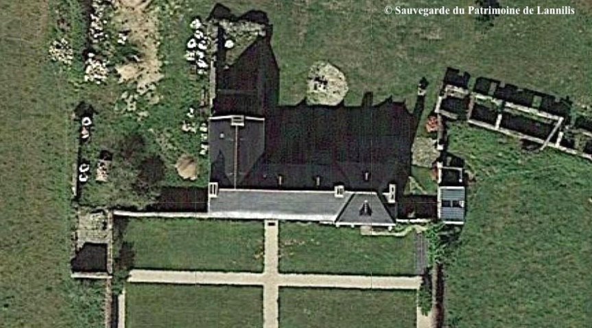 Elle apparait sur les vues aériennes actuelles, adossée au mur qui clos le jardin, à l’ouest du manoir.