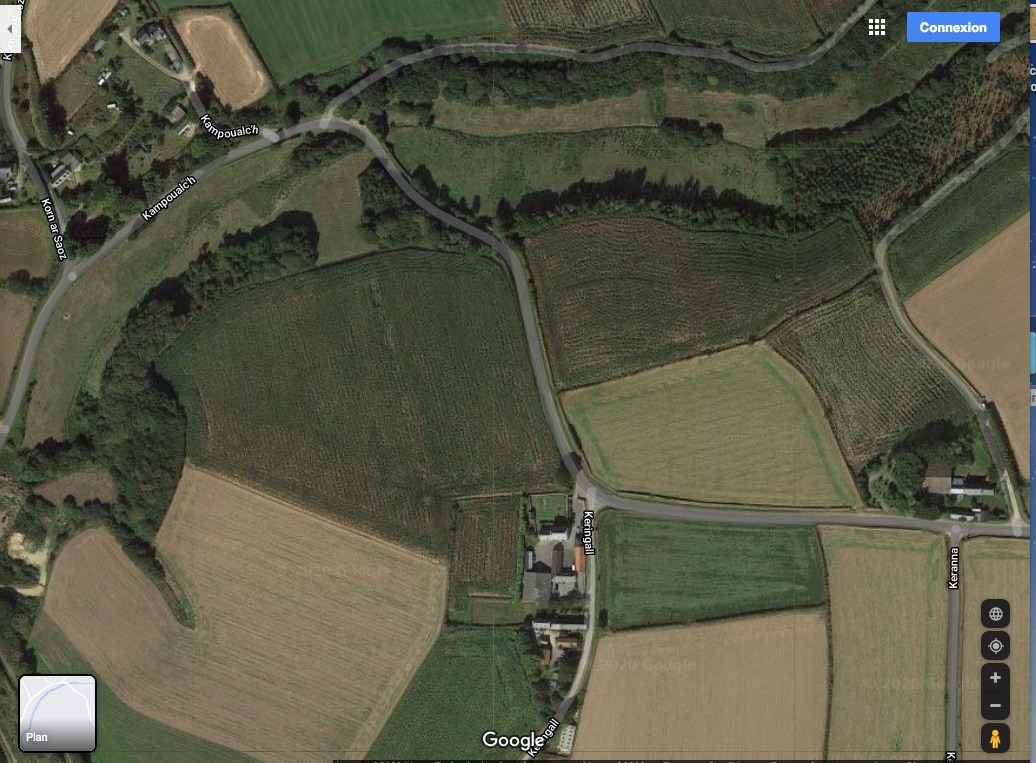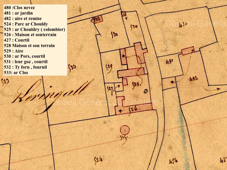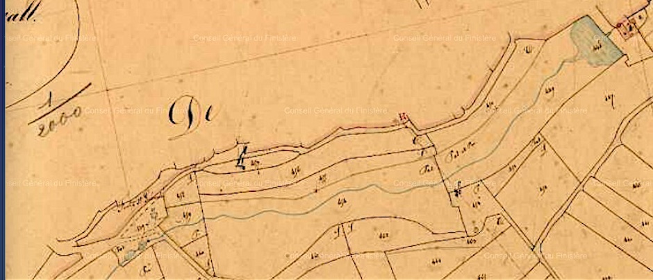 Tout près, on trouve deux parcs , un pré et fenier avec un douet à rouir le lin, bordés par le chemin conduisant du village de Kersalou au moulin nommé an milin nevez.